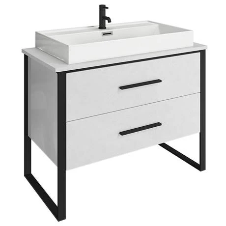 (1) Arezzo 1000 Gloss White Matt Black Framed 2 Drawer Vanity Unit with Worktop