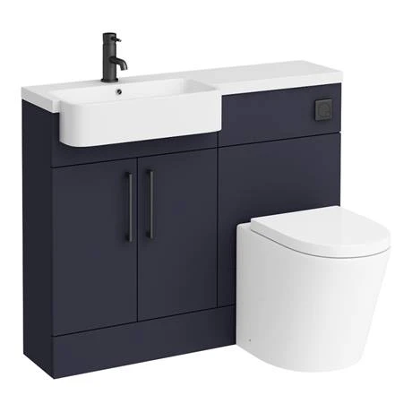 The stylish space saving Arezzo matt blue semi-recessed basin bathroom combination unit, perfect for renewing the style in any cloakroom, en-suite or smaller bathroom where space limited. It’s stylish modern design hides all unsightly pipework creating a neat modern look, provides ample storage, perfect for a busy family bathroom. Features a eye catching matt blue finish, contemporary matt black square bar handles, concealed cistern with matt black flush button and a solid round semi-recessed poly-marble basin with worktop.