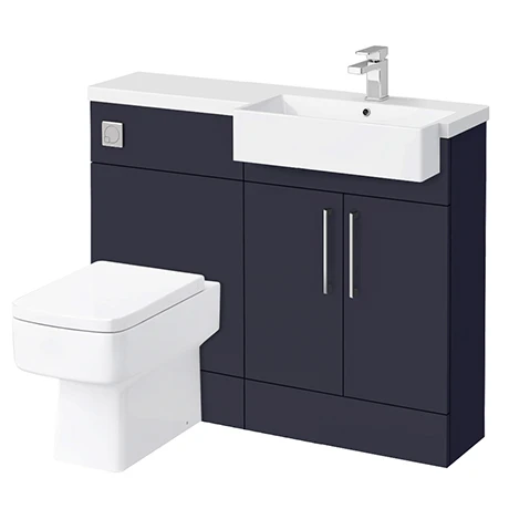 The stylish space saving Arezzo matt blue semi-recessed basin bathroom combination unit, perfect for renewing the style in any cloakroom, en-suite or smaller bathroom where space limited. It’s stylish modern design hides all unsightly pipework creating a neat modern look, provides ample storage, perfect for a busy family bathroom. Features a eye catching matt blue finish, contemporary polished chrome square bar handles, concealed cistern with chrome flush button and a solid square semi-recessed poly-marble basin with worktop.