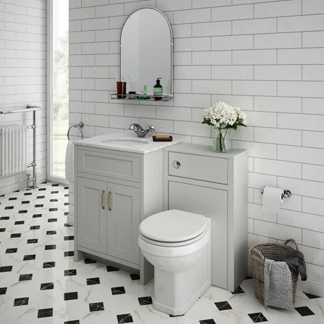 The Chatsworth traditional 610mm wide grey vanity unit marble basin top with wc unit package, Victorian inspired design with a modern twist. The Chatsworth range of charming bathroom furniture features classic styling with a satin grey finish cabinet and tongue-and-groove side panelling.