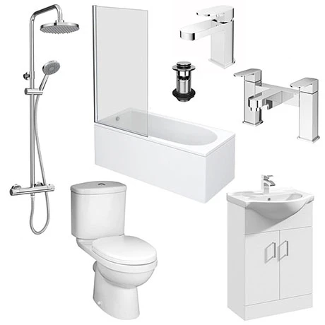 Renovating a tired bathroom? The Drift Complete Modern Bathroom Package offers a fresh, contemporary style. This package includes all the features essential for completing a bathroom, from a long bath to a close coupled toilet. The components of this vanity unit bathroom suite are styled in either a gloss white or sparkling chrome finish for a subtle, timeless style. Everything is also made to last – durable ceramic, brass and toughened glass materials will guard effectively against damage. This understated modern bathroom suite means you can make a statement with a patterned wall or floor tiles.