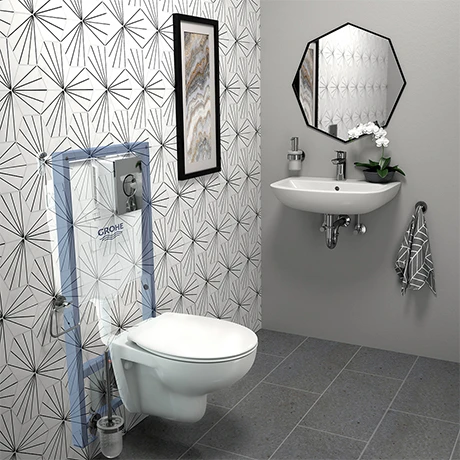 The Bau Ceramic basin package consists of wall hung basin, tap and waste, tubular p-trap, shut-off valves and fixing kit. The basin is manufactured from high grade vitreous china and finished in Alpine White. The stylish basin tap is supplied with an integrated pop-up waste and features GROHE EcoJoy® water saving function.