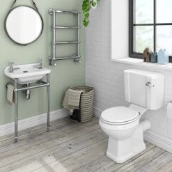 The elegant Keswick Traditional cloakroom suite, ideal for creating a period look in your bathroom. Features a quality close coupled toilet with a stunning traditional 515mm wide compact basin with chrome wash stand. This space saving suite is great for getting the most out of any smaller room.