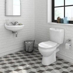 The stylish Novad compact ceramic cloakroom suite, beautifully designed and manufactured from quality white gloss ceramic, ideal for bathrooms and cloakrooms with limited space. Features a wall hung 500mm cloakroom basin and a dual flush ceramic close coupled modern toilet with standard seat.