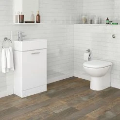 The minimalist cubix cloakroom suite designed and manufactured by leading bathroom brand Nuie, includes a modern contemporary compact vanity unit with a rectangular ceramic 1 tap hole washbasin in a trendy white gloss finish, a stylish high quality ceramic modern D-shaped back to wall pan with a soft closing seat and a concealed WC cistern with chrome dual flush button which can be placed behind a wall or in a vanity unit (sold separately). Make the most of your bathroom with our practical and attractive compact suites.