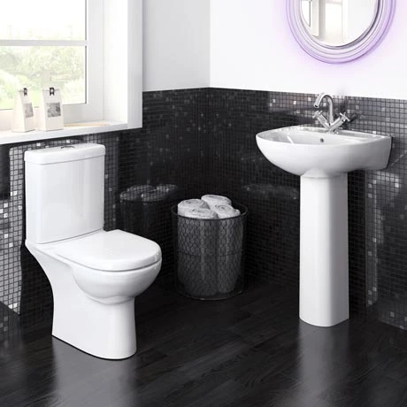 The stylish contemporary Lawton compact 4 piece modern bathroom suite, features a close coupled toilet with a projection of only 630mm and a 550mm wide round basin with full pedestal.