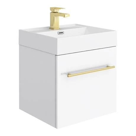 Supplied with a durable gloss white cabinet with matching thin edged polymarble basin and minimalist brushed brass T-bar handle.